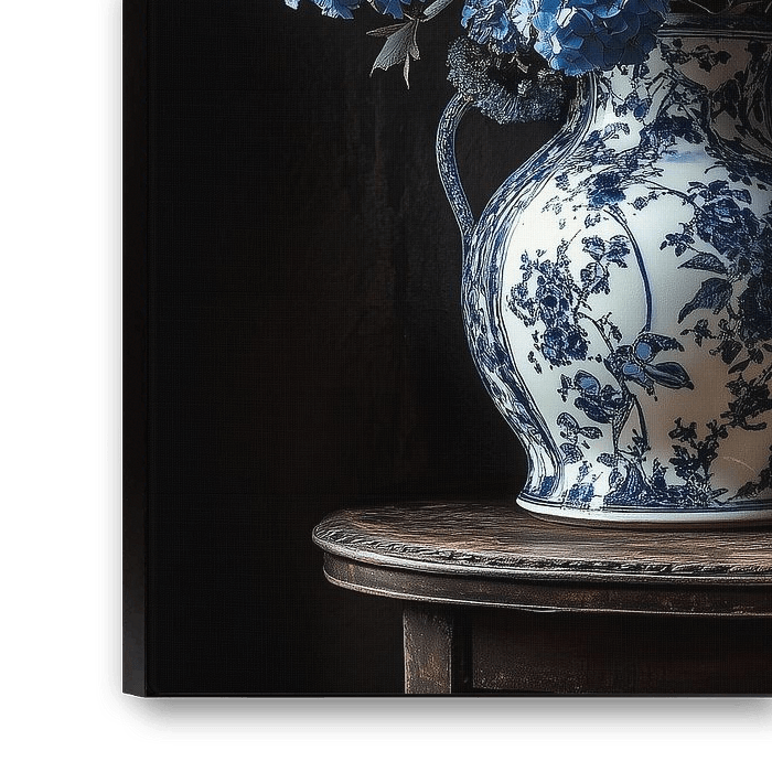 Dieses Stillleben fängt einen Moment subtiler Gelassenheit ein, in dem klassische Delfter Keramik und die Schönheit des einfachen Lichts perfekt zusammenkommen. Eine Vase mit den charakteristischen blauen und weißen Mustern steht auf einem verwitterten Holztisch, wobei die sorgfältig ausgearbeiteten Linien des Porzellans die Aufmerksamkeit auf sich ziehen. Die Vase selbst scheint in dem weichen, warmen Licht, das von links einfällt, zu atmen, und das zarte Blau der Blumen auf der Vase wird im Schein des Sonnenlichts lebendig.