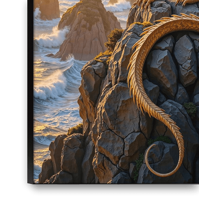 Hoch über den tosenden Wellen thront der goldene Drache auf schroffen Klippen. Sein Körper glänzt im warmen Sonnenlicht, während das Meer unter ihm gegen die Felsen schlägt. Die ausgebreiteten Flügel wirken wie aus geschmolzenem Gold geformt, majestätisch und ruhig zugleich.