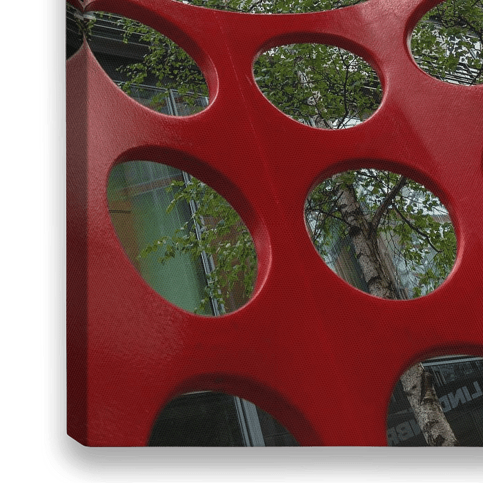 Das Kunstwerk „SONY Center Berlin – Dach“ zeigt eine ungewöhnliche Perspektive auf die ikonische Dachkonstruktion des Sony Centers am Potsdamer Platz. Der Blick richtet sich nach oben, durch eine rote, perforierte Skulptur mit kreisförmigen Öffnungen. Diese rahmen die architektonischen Elemente des Daches ein – radial gespannte…