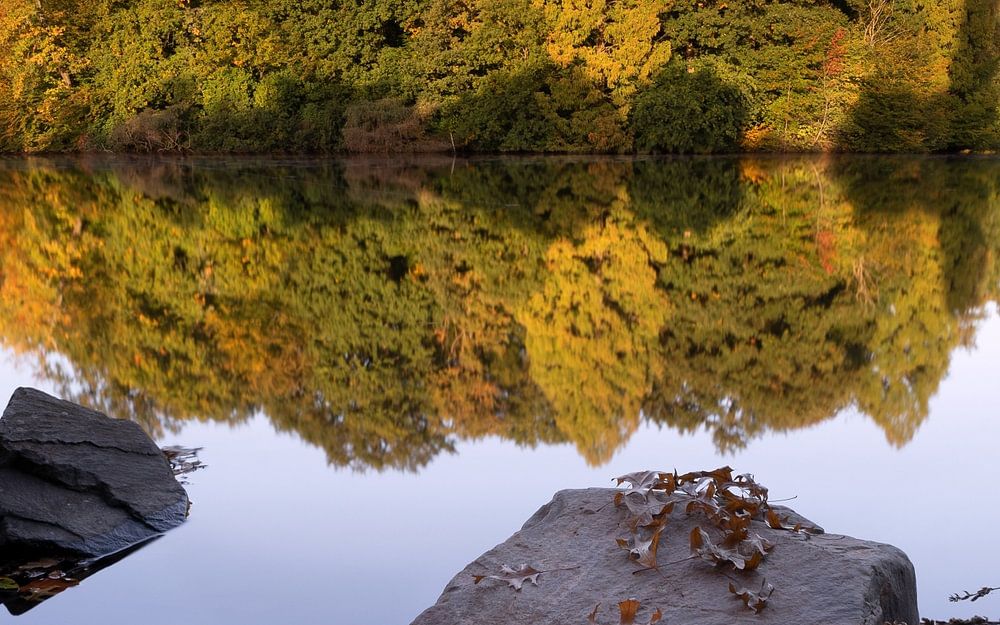 Idyllische Landschaft im Naturschutzgebiet Saaler Mühle rund um den Bensberger See in Bergisch Gladbach, Herbst im Bergischen Land, Nordrhein-Westfalen, Deutschland