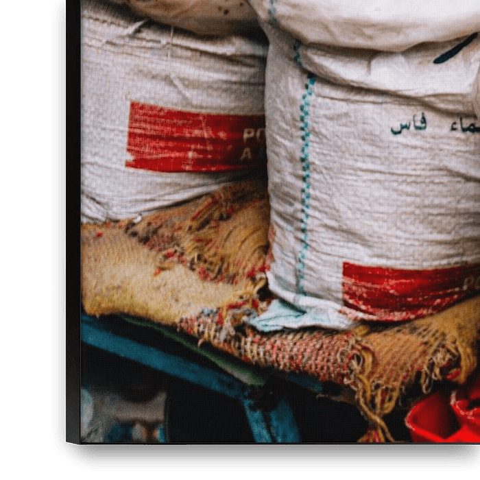 In den Straßen von Chefchaouen in Marokko werden Säcke mit farbigem Pulver verkauft.