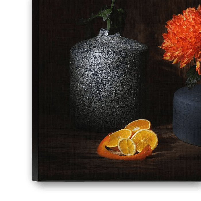 Stilleben mit fröhlichen orangenen Chrysanthemen, Orangenscheiben in Keramikvasen. Clair obscur Stil mit fröhlicher, warmer, saftiger Farbe und leicht in den Raum einzupassen.