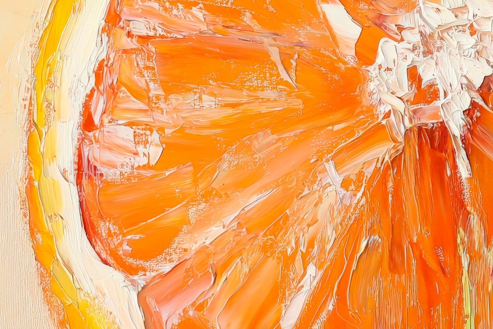 Frische, leuchtende Farben strahlen Wärme und Fruchtbarkeit aus, während die saftige Struktur der Orangenhälfte das Gefühl von Genuss und Lebensfreude weckt. Ideale Ergänzung für die Küche, wo sie sowohl appetitlich als auch inspirierend wirkt, und die Sinne bei der Zubereitung von Speisen anregt. Perfekt für einen lebendigen Akzent!