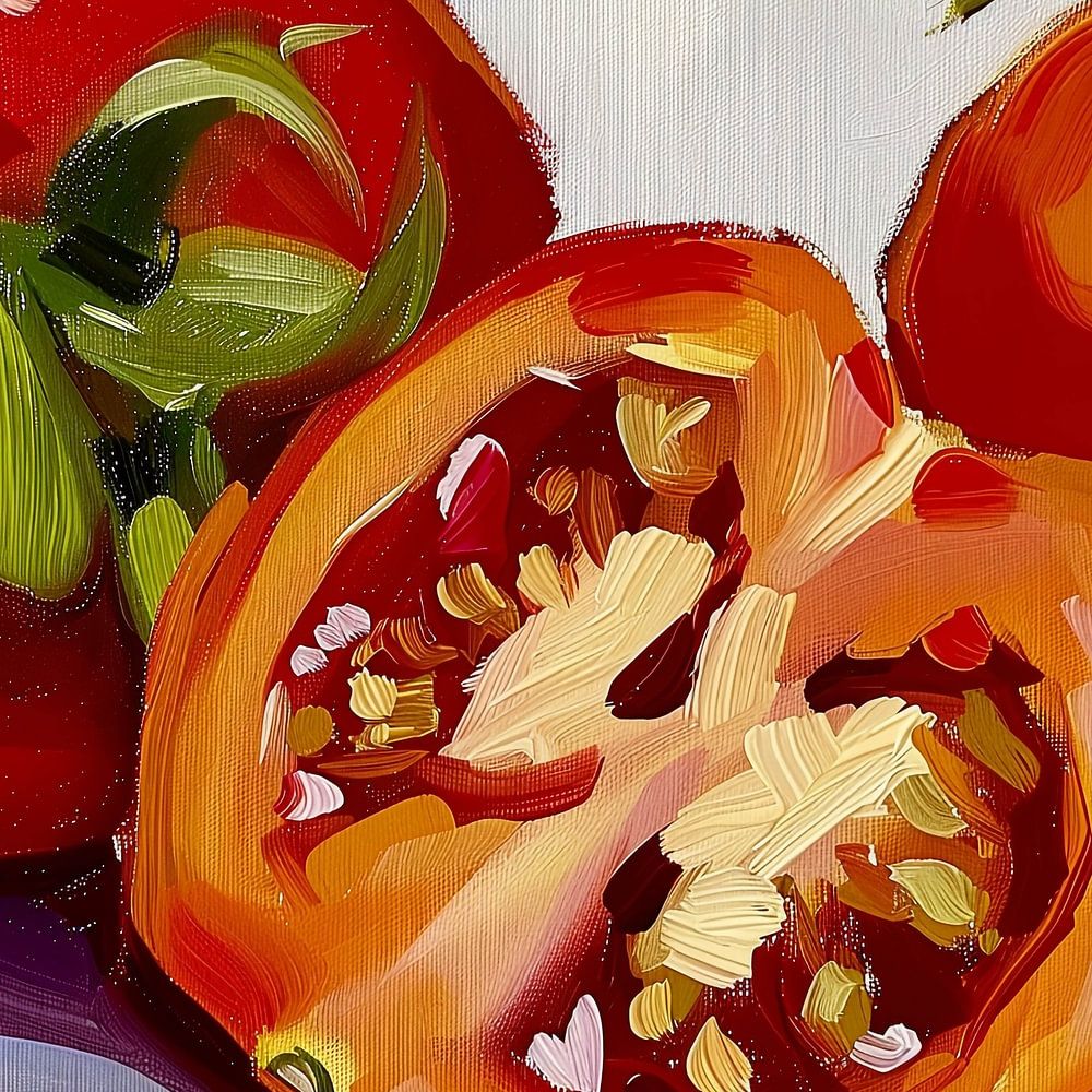 Realistische Darstellung von reifen Tomaten, die sich auf das Spiel von Licht und Schatten und die satten, leuchtenden Farben konzentriert. Die Pinselstriche sind locker, aber präzise und machen die Textur und Saftigkeit der Tomaten fast greifbar. Eine halbe Tomate ist zu sehen, wobei die Kerne und das Fruchtfleisch detailliert dargestellt sind. Die Schatten unter den Tomaten verleihen dem Bild Tiefe und verstärken den dreidimensionalen Effekt. Der weiße Hintergrund steht in starkem Kontrast zur roten Farbe der Tomaten und lenkt die Aufmerksamkeit des Betrachters auf das Motiv. Kleine Details wie die subtilen Spiegelungen und die Art und Weise, wie das Licht die Formen der Tomaten hervorhebt, zeigen die Fähigkeit des Künstlers, die Schönheit des Alltags einzufangen.
