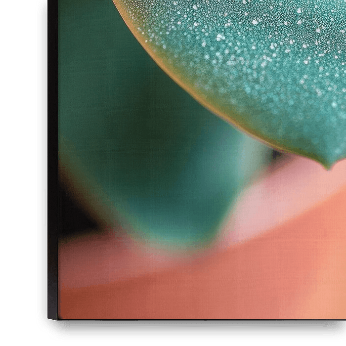 Ein zartes Spiel aus sanften Grüntönen und glitzernden Wassertropfen verweist auf die frische Lebendigkeit einer Sukkulente, die mit ihrer beruhigenden Ausstrahlung jeden Raum erhellt. Ideal für das Wohnzimmer oder die Küche, bringt sie eine harmonische Note der Natur in die modernsten Wohnwelten.
