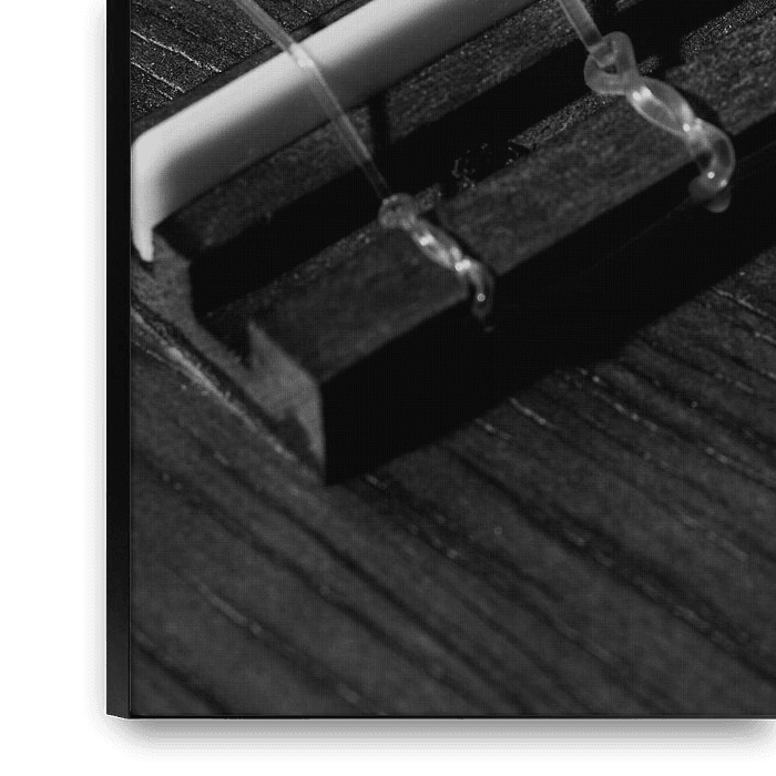 Diese Nahaufnahme eines Ukulelenstegs mit Nylonsaiten, aufgenommen in elegantem Schwarz-Weiß, fängt die Essenz von Musik und Handwerkskunst ein. Die sorgfältig ausgerichteten Saiten, jede einzelne wie eine künstlerische Symphonie in Schwarzweiß, unterstreichen das empfindliche Gleichgewicht zwischen Form und Funktion. Das Bild strahlt…