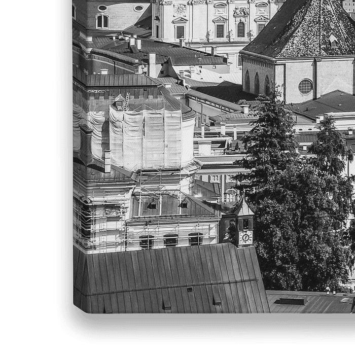 Schwarzweißfotografie Blick auf die Innenstadt mit der Franziskanerkirche, dem Dom und der Festung Hohensalzburg in Salzburg, Österreich