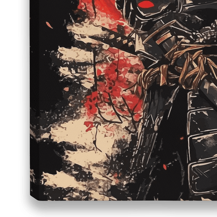 Das Kunstwerk zeigt einen furchterregenden japanischen Samurai in einer aufwendigen Rüstung, der ein schimmerndes Katana schwingt. Vor dem eindrucksvollen Hintergrund einer roten Sonne wirbeln zarte rote Kirschblüten um ihn herum, die Schönheit und die Vergänglichkeit des Lebens symbolisieren. Dieses traditionelle Gemälde fängt die…
