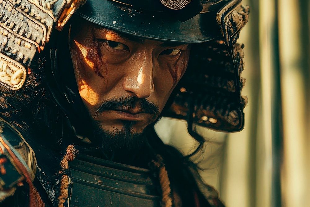 Bestelle dieses Porträt Samurai im Bambuswald – Dramatisch von Poster Art Shop als Reproduktion auf Leinwand, Alu-Dibond, als Poster, Fototapete oder Acrylglasbild.