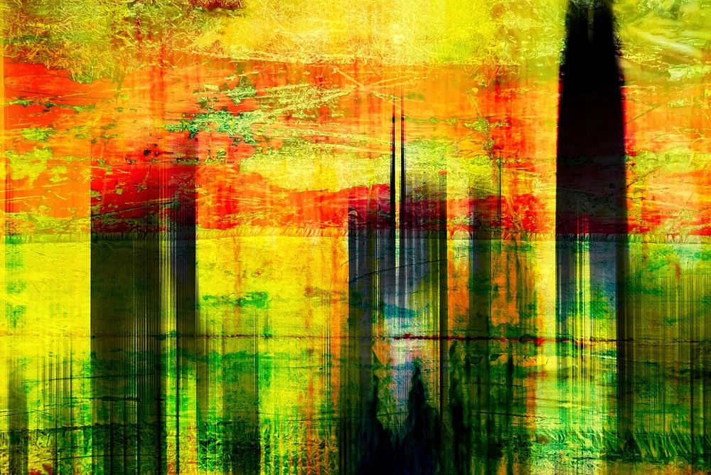 Foto Collage Skyline der Architektur von Wolkenkratzer in Downtown San Francisco in Kalifornien USA abstrakt in bunt als Pop Art