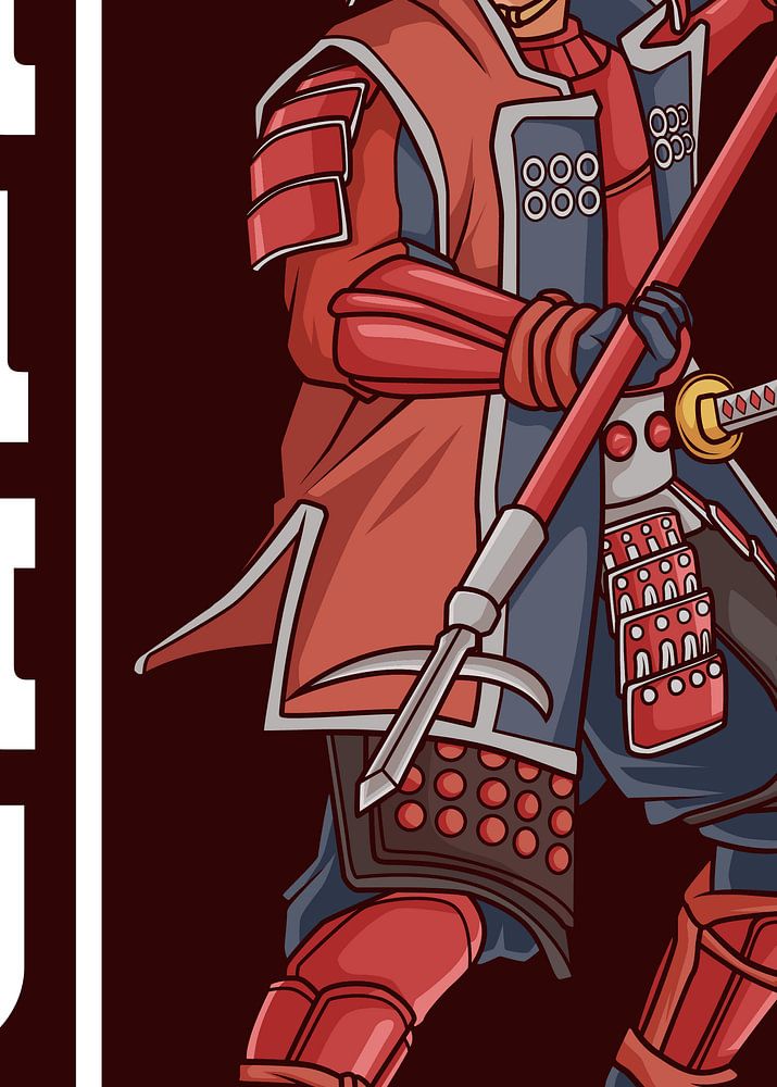 Sanada Yukimura, bekannt für seinen Mut in der Belagerung von Osaka, wird mit roter Rüstung und Speer dargestellt. Sein Helm ist mit Hirschgeweih verziert, was seine kämpferische Ausstrahlung verstärkt. Die Szene strahlt Entschlossenheit, Ehre und Kampfgeist aus.