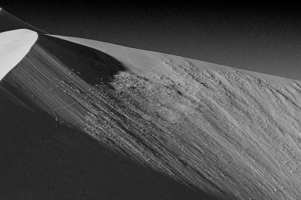 Lange Schatten am frühen Morgen in der Nähe von Sessriem. Das gleitende Licht hebt die Formen der Sanddünen hervor.