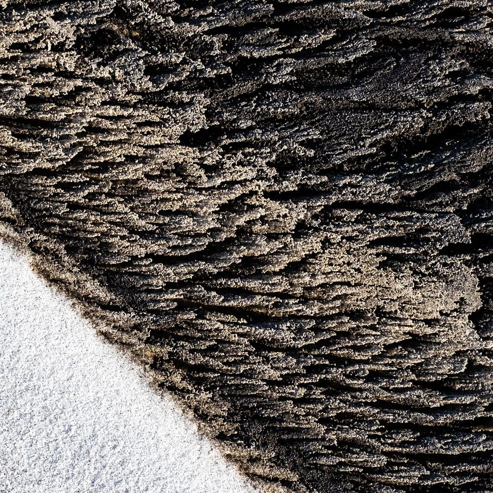 An einem schwarzen Strand (Lavasand) in Island wurde Sand durch einen starken Wind mit Schnee vermischt. So entstehen ungewöhnliche Muster und satte Farben. Groß ausgedruckt, kann man die Sandkörner fast fühlen.