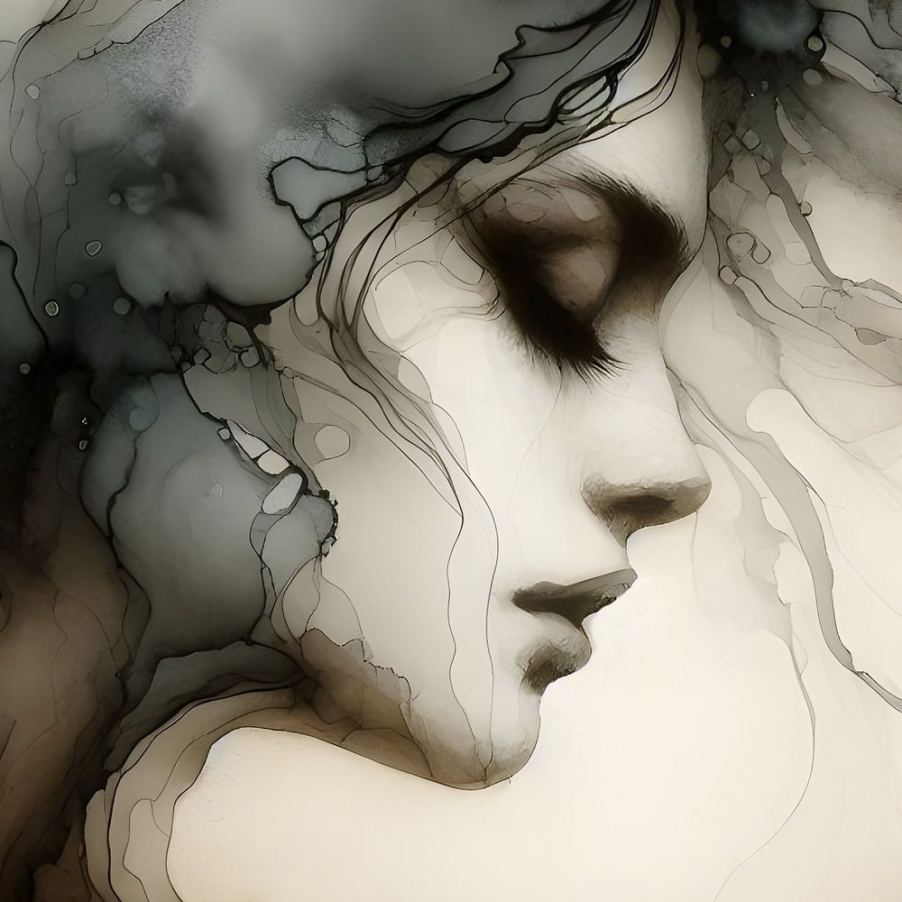 Ein verträumtes Aquarell zeigt eine Frau mit langem, fließendem Haar, das langsam in den Hintergrund übergeht. Ihr Haar verschmilzt mit abstrakten Formen und Linien, als wären das Bild und sie selbst eins. Sanfte Braun- und Rosatöne fließen mühelos ineinander, typisch für die transparente Natur der Aquarellfarbe. Ihr Gesicht ist nur teilweise sichtbar, umhüllt von Farbe und Atmosphäre. Das Ganze atmet Verletzlichkeit, Wärme und einen Hauch von Geheimnis.