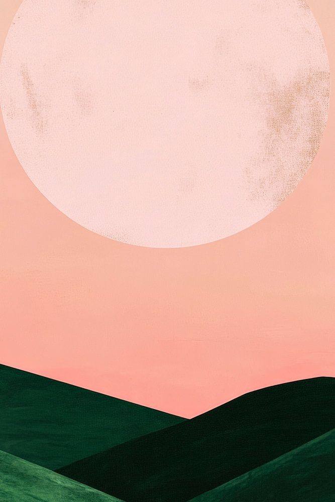 Sanfte Hügel verschmelzen mit einem zart-pinken Himmel, während eine leuchtende, fast melancholische Mondscheibe diese ruhige Landschaft überblickt. Die harmonischen Farben und das minimalistische Design verleihen jedem Raum eine entspannende Atmosphäre – perfekt für das Schlafzimmer, wo sie zu besinnlichen Momenten und süßen Träumen einlädt.