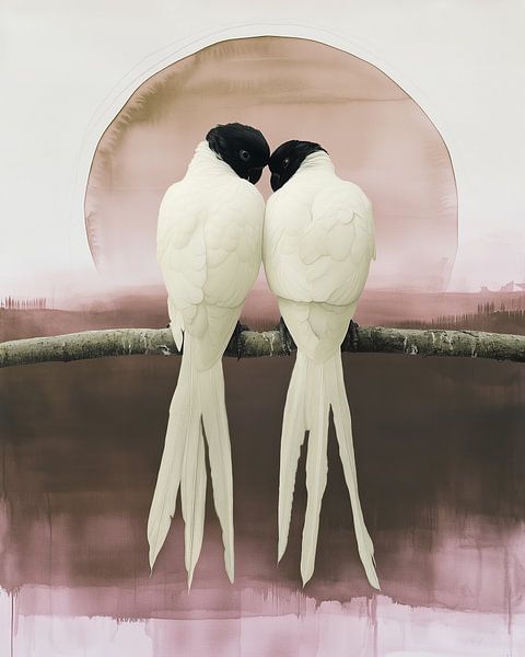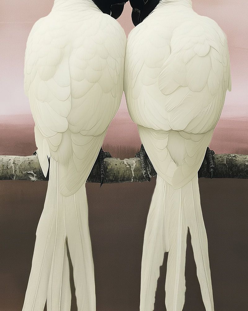 Zwei elegante Vögel ruhen Seite an Seite auf einem schmalen Ast, ihre Körper spiegeln sich fast perfekt in einer stillen, intimen Haltung wider. Ihr weißes Gefieder geht sanft ineinander über, während sich ihre dunklen Köpfe leicht berühren – ein zärtlicher Moment der Verbundenheit, der den Kern des Bildes bildet. Die langen, schlanken…