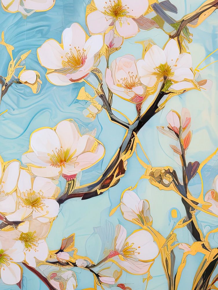 Sanftes Frühlingsgeflüster - Dieses Blumenbild zeigt eine lebendige Darstellung von Apfelblüten, wobei die zarten, blassrosa Blüten einen schönen Kontrast zu einem intensiven blauen Hintergrund bilden.