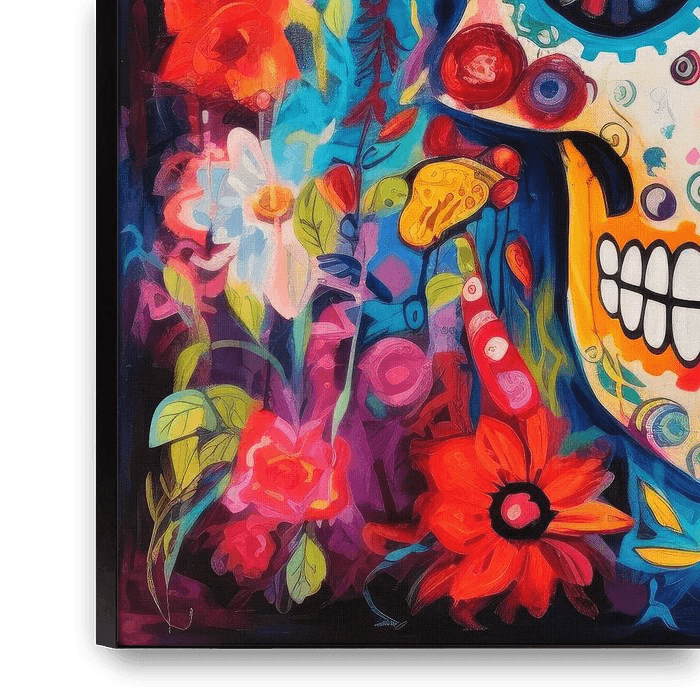 Digitale bunte, mit vielen Blumen verzierte Totenkopf-Illustration, die wie ein handgemaltes Bild anmutet.