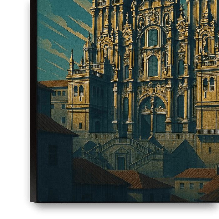 Bestelle dieses Art Deco-Wandbild Santiago de Compostela Kathedrale Art Deco Poster von Travel Shop als Reproduktion auf Leinwand, Alu-Dibond, als Poster, Fototapete oder Acrylglasbild.