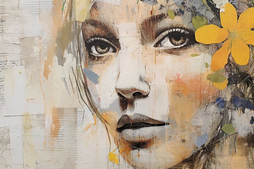 Sarah Portrait - abstrakte Malerei / Mischtechnik gemalt. Schöner Kontrast zwischen anspruchsvollem Portrait und roher Collage/Maltechnik.