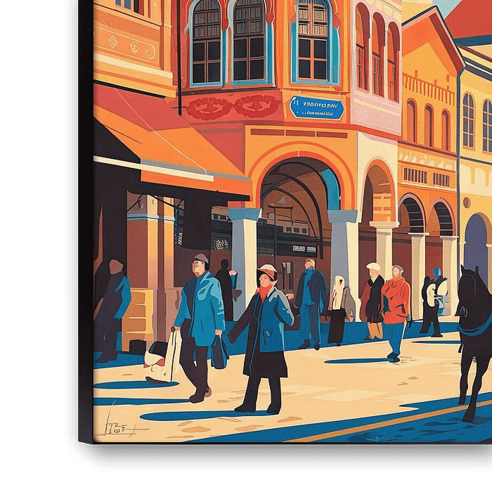 Ein farbenfrohes Panorama entfaltet sich: Historische Gebäude mit orientalischen Bouquets und charakteristischen Kuppeln laden zum Erkunden ein. Während Menschen durch die belebte Straße flanieren, zieht eine elegante Pferdekutsche die Blicke auf sich. Sanfte Wolken umrahmen den strahlend blauen Himmel über Sarajevo, wo Tradition und Moderne harmonisch verschmelzen.