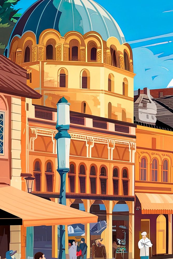 Inmitten malerischer Architektur erstrahlt Sarajevo in lebendigen Farben. Die stilvollen Kuppeln und historischen Gebäude erzählen von kultureller Vielfalt. Pferdekutschen trotzen der Zeit, während Cafés zum Verweilen einladen. Diese Szenerie verbindet Tradition mit einem Hauch von Modernität, verleiht der Stadt einen faszinierenden Charme und lädt zur Erkundung ein.