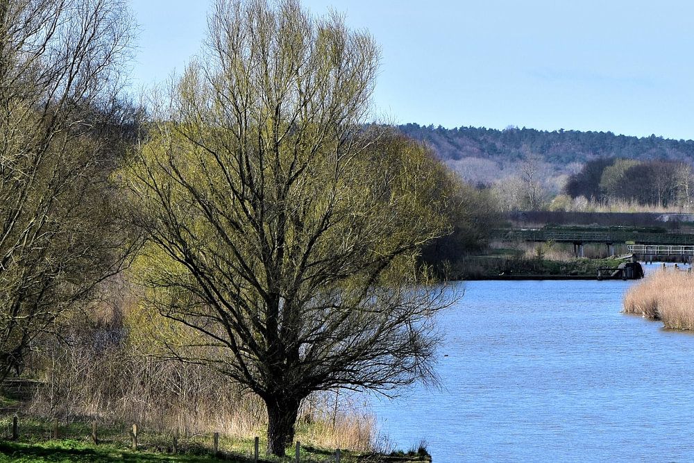 Saskevaart, Oudkarspel, Blick von der Saskerbrücke mit den Schoorl-Dünen in der Ferne, Standort Oudkarspel