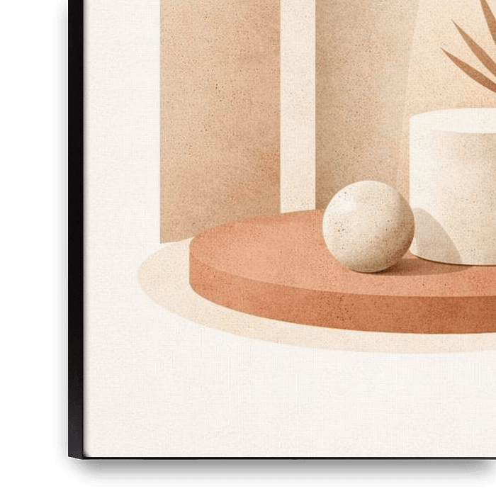 Dieses Kunstwerk ist eine Reise in einen minimalistischen Wüstentraum, in dem architektonische Geometrie auf organische Weichheit trifft. Es zeigt einen großen Torbogen, der einen ruhigen Raum umrahmt, akzentuiert durch einen zylindrischen Sockel, eine perfekte Kugel und ein zartes Palmblatt. Ein einzigartiges Element, das auf den…