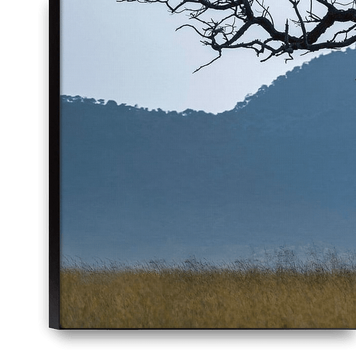 Dies ist ein Bild aus dem Kidepo Valley National Park in Uganda. Das Foto zeigt einen einsamen, kahlen Baum als Silhouette vor den blau gefärbten Bergen im Hintergrund und dem goldenen Savannengrasland im Vordergrund. Die Komposition vermittelt ein dramatisches Gefühl von Isolation und Unverwüstlichkeit.