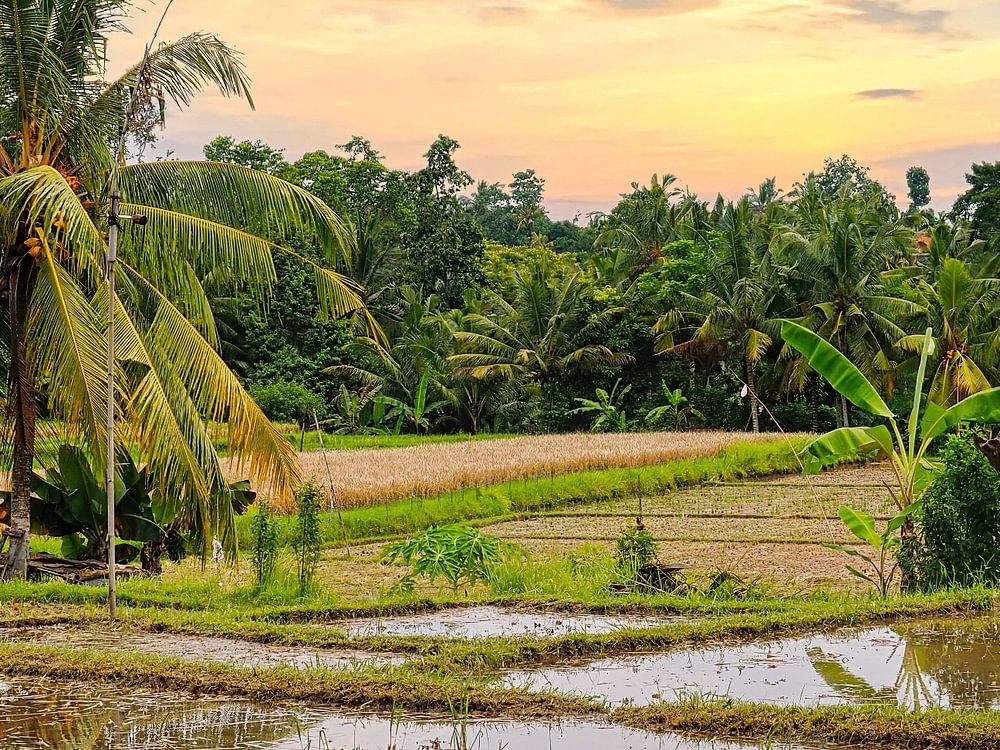 Landschaft der Nassreisfelder auf Bali, nahe Ubud, halb unbestückt, am Nachmittag.