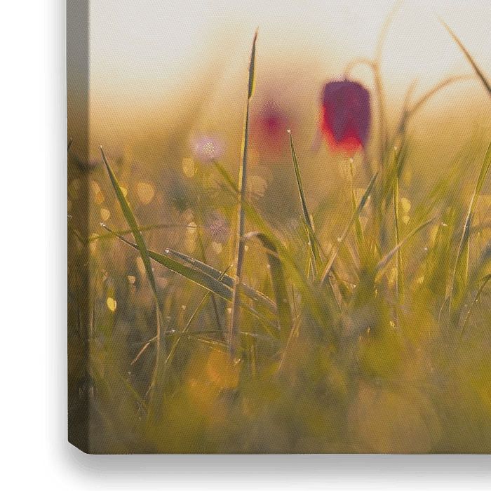 Schachblume (Fritillaria meleagris) auf einer Wiese während eines schönen Sonnenaufgangs im Frühling mit Tautropfen auf dem Gras. Diese seltene Wildblume wächst in den Überschwemmungsgebieten des Flusses IJssel in der Overijssel, Niederlande.