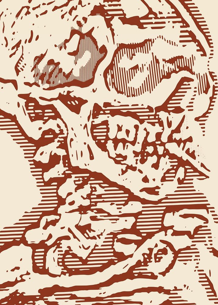 Minimalistische Linienkunst nach einem klassischen Gemälde: Schädel eines Skeletts mit einer brennenden Zigarette - Vincent van Gogh