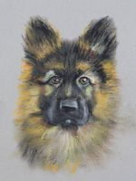 Ein Porträt eines jungen Deutschen Schäferhundes. Technik: Ölpastell auf Papier.