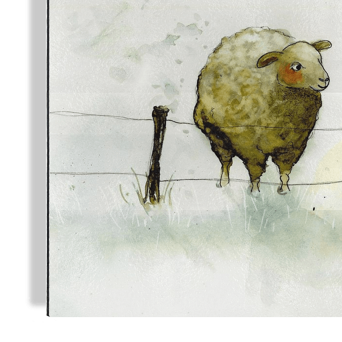 Ein Schaf spricht mit einem Rotkehlchen. Die anderen Schafe schauen aus der Ferne zu.