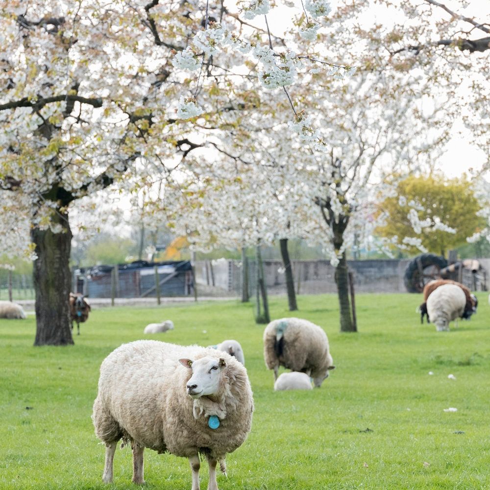 Schafe und Lämmer im Frühjahr unter blühenden Kirschbäumen mit weißen Blüten