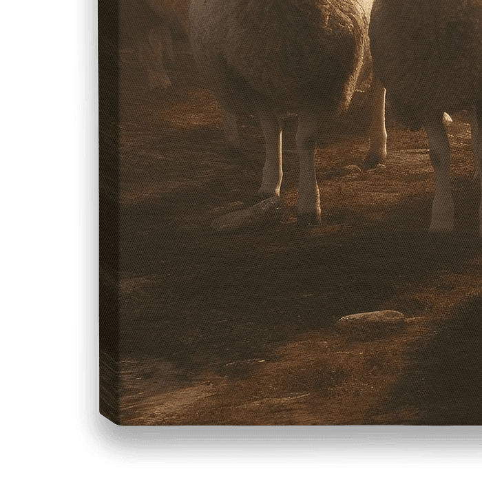 Ein sonniger Nachmittag im Moor von Drenthe, wo eine Schafherde in einer Ecke des Feldes zusammensteht. Ein schönes Gemälde, das dieses bekannte Nutztier darstellt. Das Panoramaformat unterstreicht die Großartigkeit der Heidelandschaft.