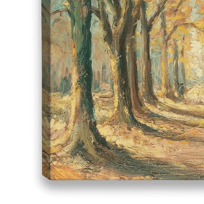 Die Blätter färben sich in Gelb- und Orangetönen. Es ist ein sonniger Herbsttag auf diesem Landschaftsgemälde. In der Ferne sind eine Schafherde und ein Hirte zu sehen, die sich durch die Allee stattlicher Bäume bewegen und auf den Betrachter…