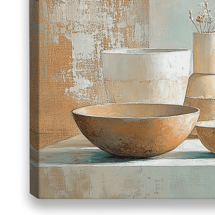 Schalen - Dieses Stillleben zeigt eine heitere Zusammenstellung von drei rustikalen Schalen und einer Vase mit einigen getrockneten Zweigen, die vor einem Hintergrund aus weichen Blau- und Brauntönen hervorgehoben werden.