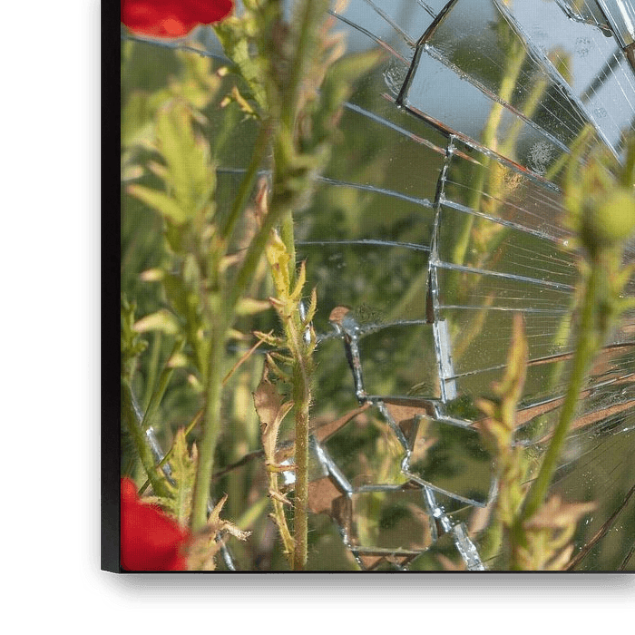 Dieses dynamische und konzeptionelle Bild fängt einen starken Moment des Kontrasts und der Störung in der Natur ein. Das helle, scharfe Muster der Glasscherben dominiert den Vordergrund und schafft einen faszinierenden Bruch in der sonnigen Landschaft dahinter. Durch die Scherben hindurch sehen wir leuchtend rote Mohnblumen und grünes Gras vor einem strahlend blauen Himmel, der die Blumen auf einzigartige Weise spiegelt und fragmentiert.