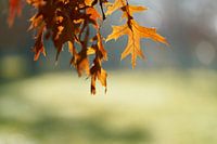 Blätter einer Scharlacheiche, Quercus coccinea mit herbstlicher Färbung in einem Park bei Magdeburg im Oktober