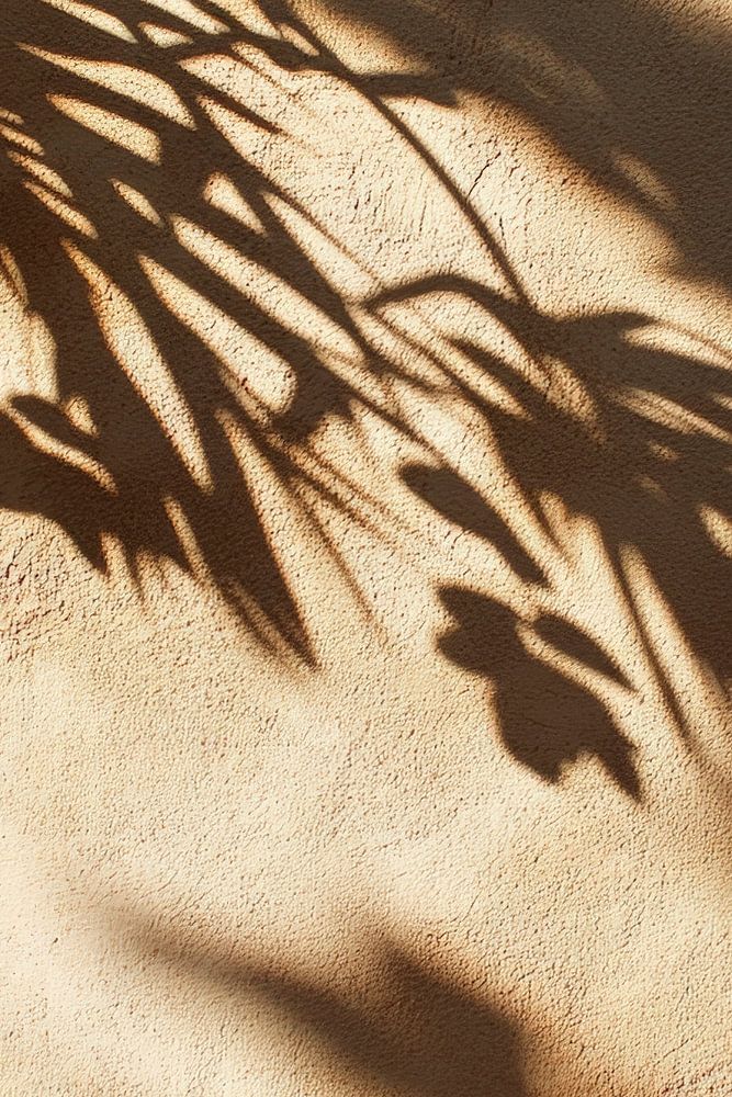 Sanfte, spielerische Schatten tanzen über eine warme, sandfarbene Wand und zaubern eine ruhige Atmosphäre. Die geschwungenen Linien und organischen Formen der Pflanzen verleihen dem Raum einen Hauch von Natur. Diese harmonische Komposition eignet sich perfekt für ein Wohnzimmer oder einen entspannten Rückzugsort, wo Licht und Schatten eine entspannende Stimmung schaffen.