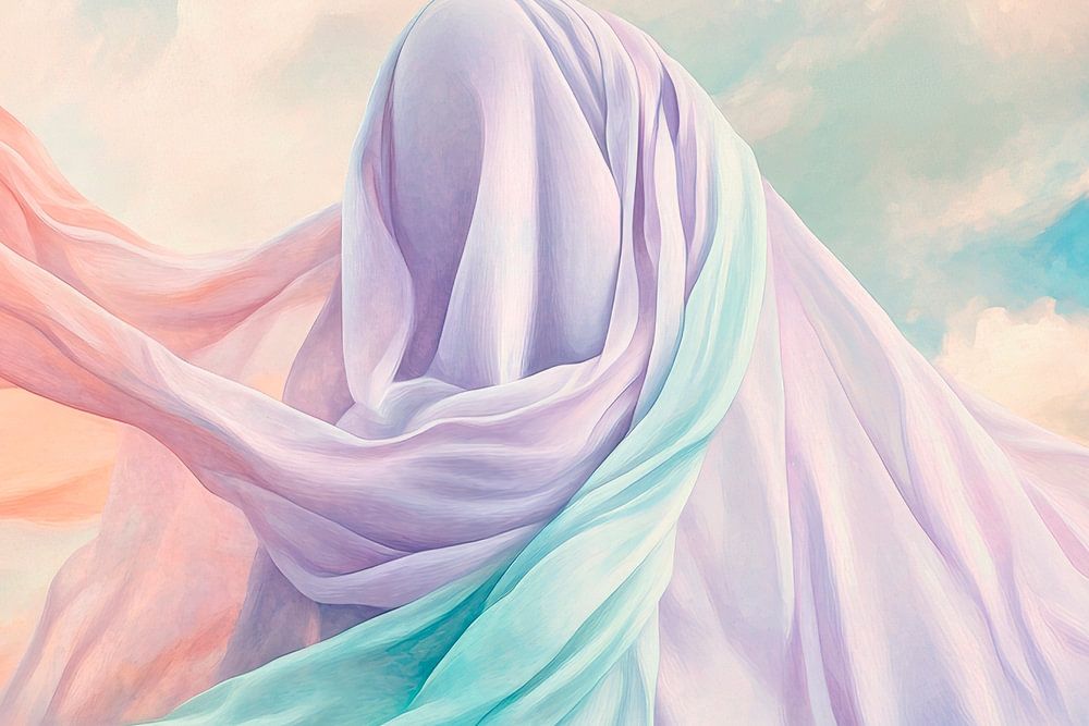 In sanften Pastelltönen schwingt ein geheimnisvolles Wesen durch die Wolken, umgeben von fließenden, zarten Tüchern, die Freiheit und Leichtigkeit symbolisieren. Diese traumhafte Darstellung erweckt den Eindruck von Bewegung und Spiritualität und verleiht dem Schlafzimmer eine beruhigende, ätherische Atmosphäre, die zum Entspannen einlädt.