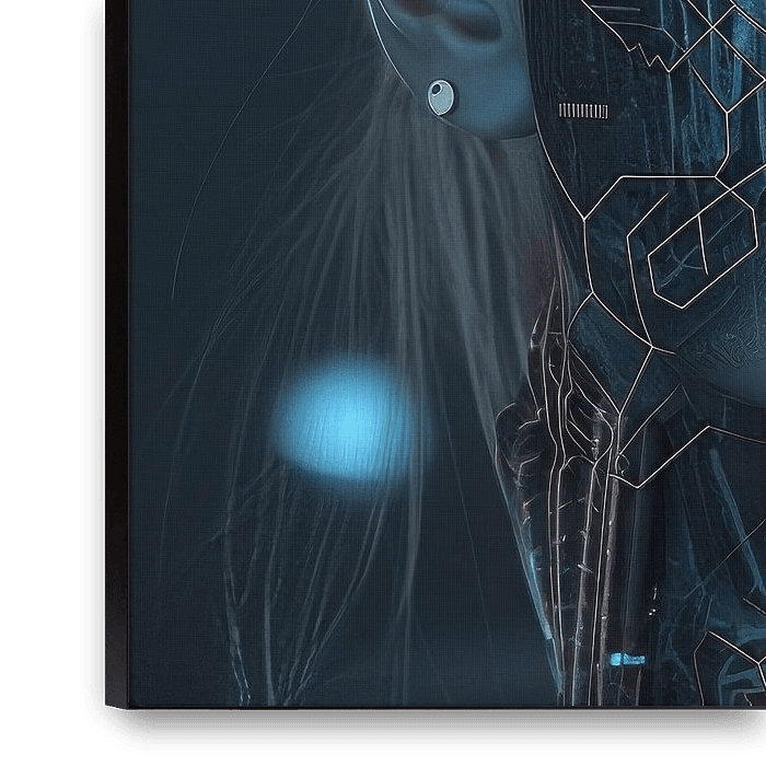 Wenn Sie dieses Porträt betrachten, ist es, als würden Sie durch die Augen dieser geheimnisvollen Dame aus der Zukunft schauen und die Welt aus ihrer Perspektive sehen. Ihr Gesicht ist mit einer subtilen holografischen Schicht überzogen, die ihr ein fast übernatürliches Aussehen verleiht. Es ist, als blicke man durch die Zeit in eine…