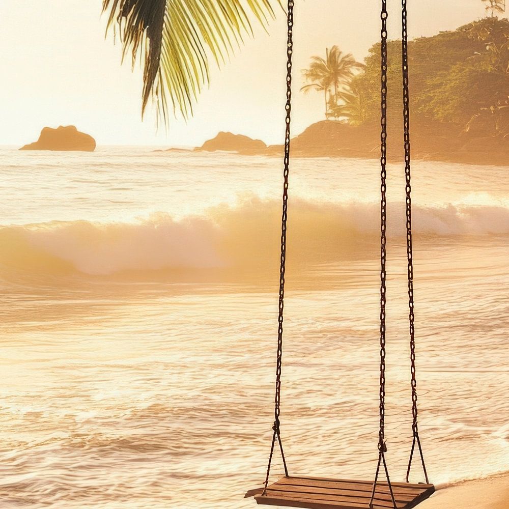 Ein sanfter Sonnenaufgang taucht die Szenerie in goldenes Licht, während sanfte Wellen rhythmisch den Sand umspülen. Eine einladende Schaukel, sanft an einem palmengesäumten Baum hängend, lädt zum Träumen und Entspannen ein. Hier vereinen sich Ruhe und Schönheit an einem traumhaften Strand, wo Zeit und Sorgen vergessen scheinen.