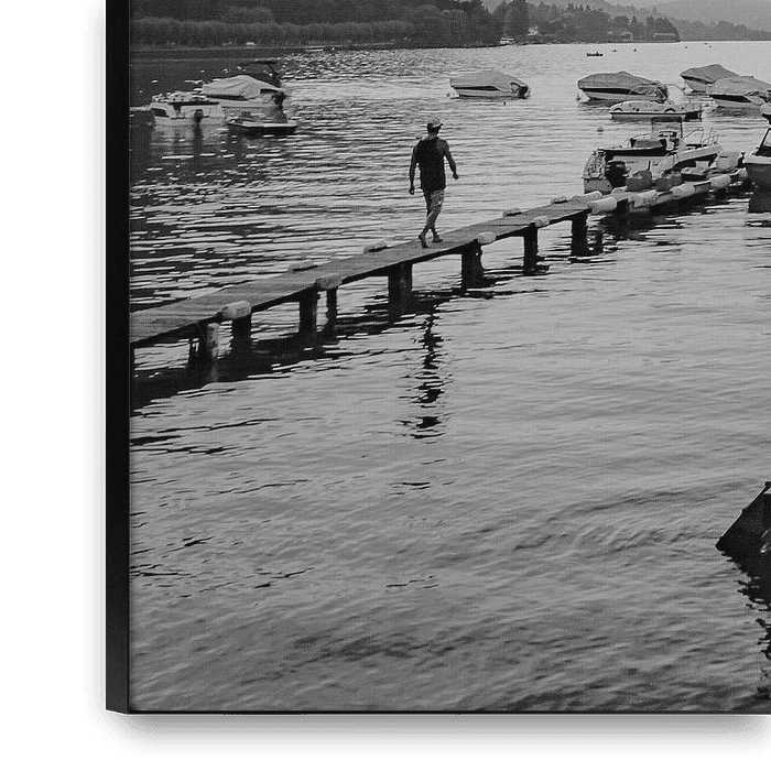 Manchmal wirken Orte wie aus der Zeit gefallen. Der See liegt ruhig da, Boote treiben verstreut wie Gedanken auf der Wasseroberfläche. Am Steg geht eine einzelne Gestalt – kaum mehr als ein Schatten – dem Licht entgegen. Die Berge im Hintergrund verlieren sich in feinen Abstufungen und verschmelzen mit dem Himmel. Das Bild ist weich,…