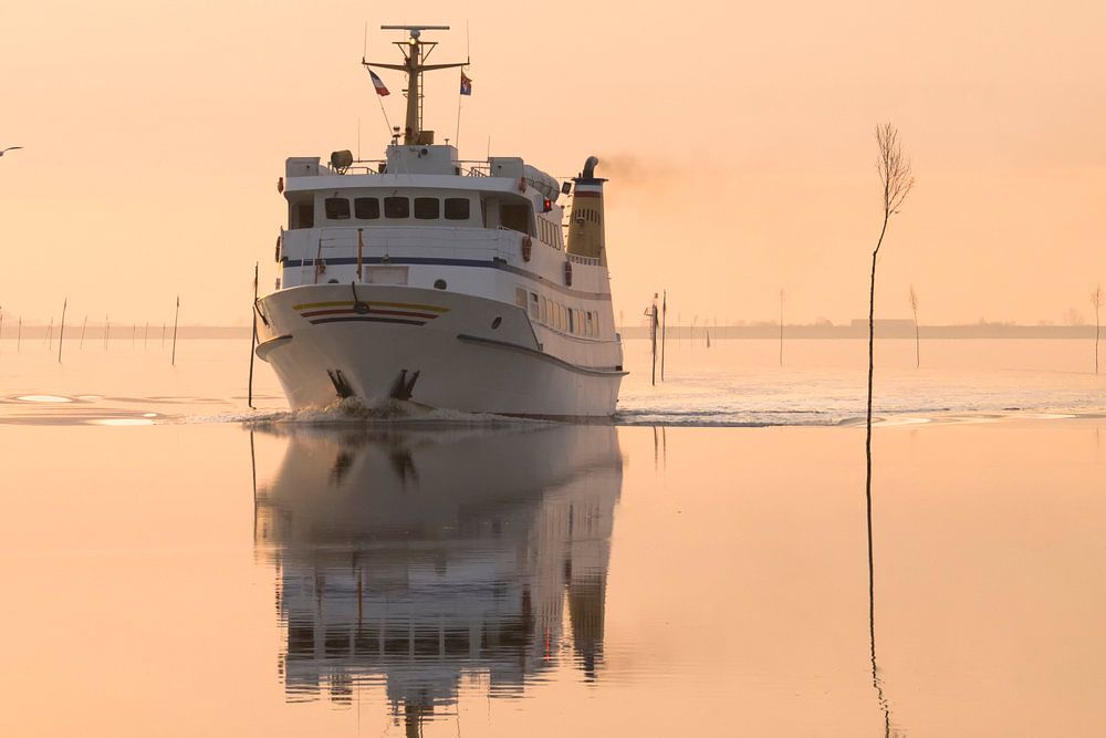 Einlaufendes Schiff in der Fahrrinne nach Husum, Nordfriesland. Durch die Windstille ist das Meer (Nordsee) ganz glatt und Schiff und Fahrrinnenmarkierungen spiegeln sich.