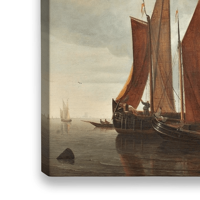 In dieser Szene stellt der Marinemaler Hendrick Dubbels einen windstillen Tag an der Küste von Dordrecht dar, an dem zwei große Flussschiffe mit roten Segeln über das Wasser gleiten. Ein Kriegsschiff feuert einen Salut auf ein sich näherndes Boot auf dem breiten Fluss. In der Ferne sind weitere Schiffe zu sehen, und am fernen Horizont ragt die Liebfrauenkirche von Dordrecht aus der flachen Küste heraus. Der graue, wolkenverhangene Himmel über dem niedrigen Horizont dominiert die Szene und verleiht dem ansonsten friedlichen und ruhigen Motiv eine gewisse Dynamik und Bewegung. Die graue Tonalität, die den größten Teil der Komposition prägt, zeugt vom Einfluss seines zeitgenössischen Kollegen Simon de Vleiger.