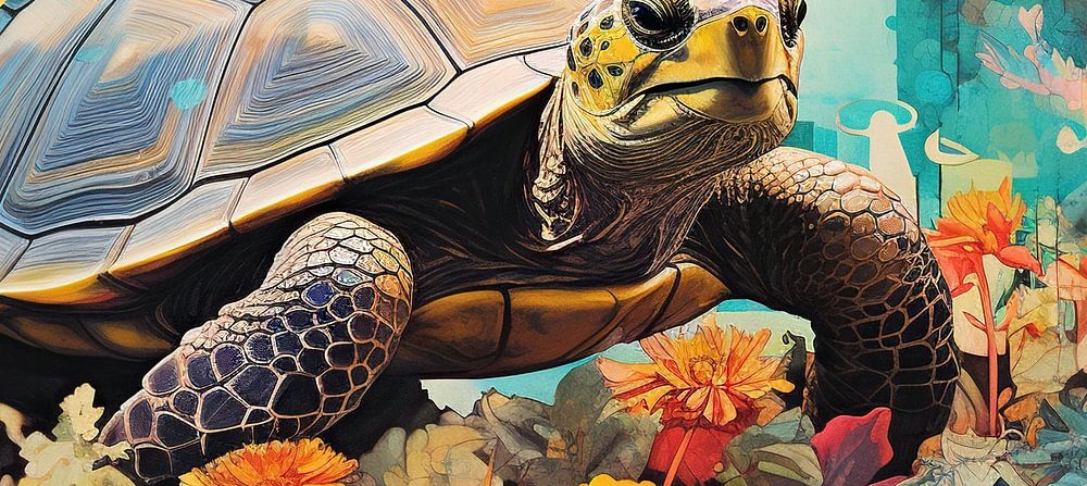 Turtle Artwork | Turtle - Im Mittelpunkt dieses Kunstwerks steht eine detailreiche Schildkröte, umgeben von einer üppigen Flora in einer farbenfrohen, fast traumhaften Landschaft. Der Stil verbindet Realismus mit Fantasie, wobei die kontrastreichen Farben der Blumen ein dynamisches Spiel mit den weichen, düsteren Hintergrundtönen spielen. Beachten Sie Details wie die subtilen Blasen und abstrakten Formen, die dem Bild eine ätherische Qualität verleihen.