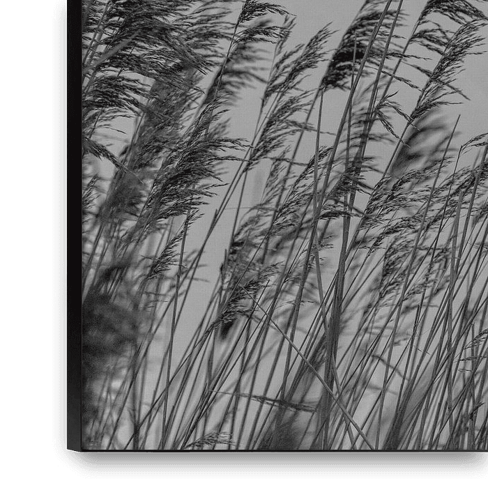 Ein verspieltes Bild von Schilf in der niederländischen Natur. Das Foto hat einen stimmungsvollen Stil. Die Schwarz- und Weißtöne unterstreichen den stimmungsvollen Stil und sehen in einem modernen Interieur großartig aus.
