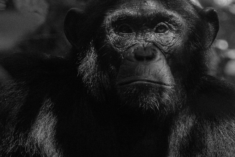 Ein Schwarz-Weiß-Foto von einem der außergewöhnlichsten Menschenaffen der Welt. Ein Schimpanse in Kibale in Uganda. Siehe mein Profil für Schwarz-Weiß-Fotos von anderen Tieren.